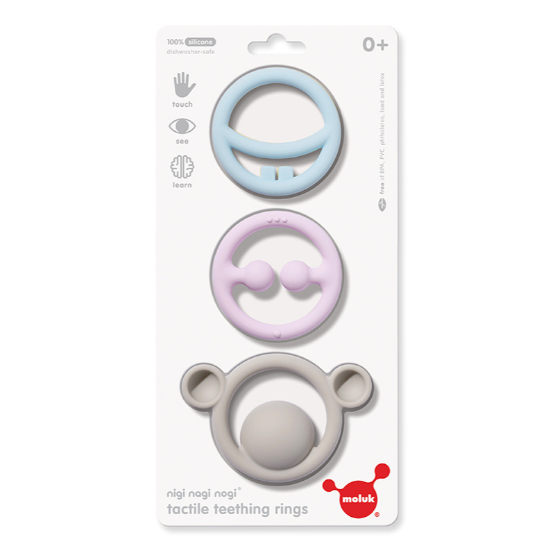 Nigi Nagi Nogi are soothing your baby’s sore gums without being an eyesore. Made of 100% food-grade silicone rubber, MOLUK's new teething rings are easy for small hands to hold and offer essential tactile and visual stimulation.